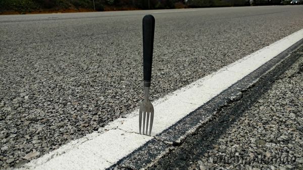 Actually, this is one of forty-two actual forks that were found and strategically relocated from SoCal Beach and PCH. The road of life also presented and still presents more forks. Including one to an upstream clean up venue...